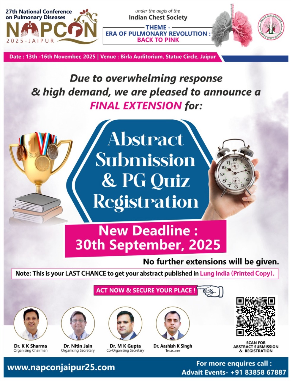 It is with great pleasure and anticipation that we invite you to the 27th National Conference on Pulmonary Diseases – NAPCON 2025, under the distinguished aegis of the Indian Chest Society (ICS). This prestigious conference will take place from 13th to 16th November 2025 at the renowned Birla Auditorium, near Statue Circle, Jaipur – a venue befitting the intellectual and academic vibrancy of this occasion.